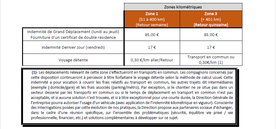 (1)- Les déplacements relevant de cette zone s’effectueront en transports en commun. Les compagnons concernés par cette disposition continueront à percevoir à titre forfaitaire le voyage détente selon la méthode de calcul usuel. Cette indemnité a pour vocation à couvrir les frais relatifs au transport en commun, les autres trajets dit intermédiaires (exemple : domicile/gare) et les frais associés (parking/métro). Par exception, si le chantier ne se situe pas dans un secteur desservi par les transports en commun ou si le temps de déplacement en transport en commun n’est pas acceptable, et si aucune solution n’est trouvée, et si à titre exceptionnel pour une courte durée, la Direction Générale de l’entreprise pourra autoriser l’usage d’un véhicule (avec application de l’indemnité kilométrique en vigueur). Consciente des interrogations posées par cette évolution de nos pratiques, la Direction propose aux partenaires sociaux d’échanger, dans le cadre d’une réunion spécifique, sur l’ensemble des problématiques (sécurité, équilibre vie privé / vie professionnelle, financier, etc.) et solutions complémentaires à développer sur ce sujet.