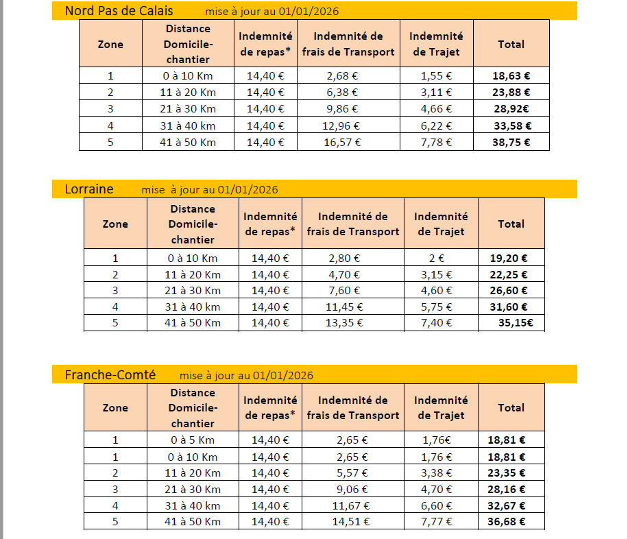 Le montant des indemnités de trajet et de transport sont définis par les conventions collectives régionales et sont accessibles auprès de votre Responsable RH.